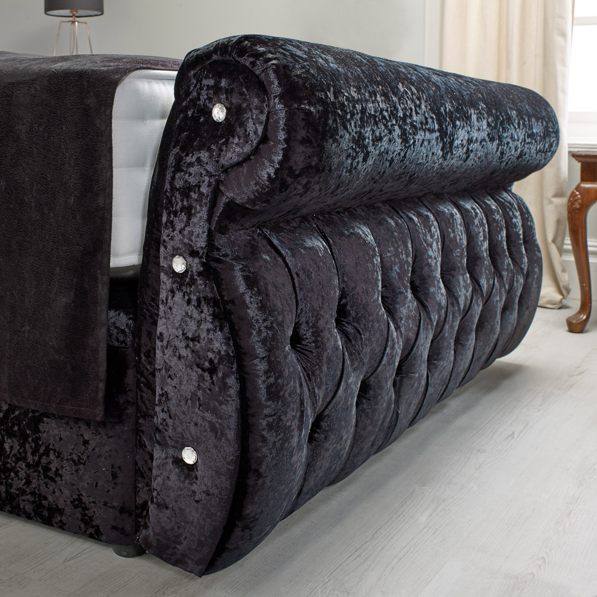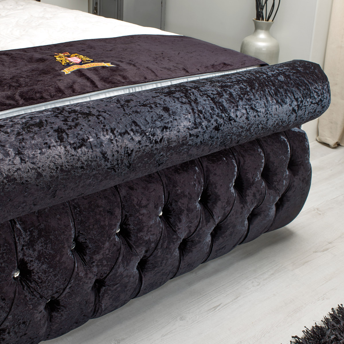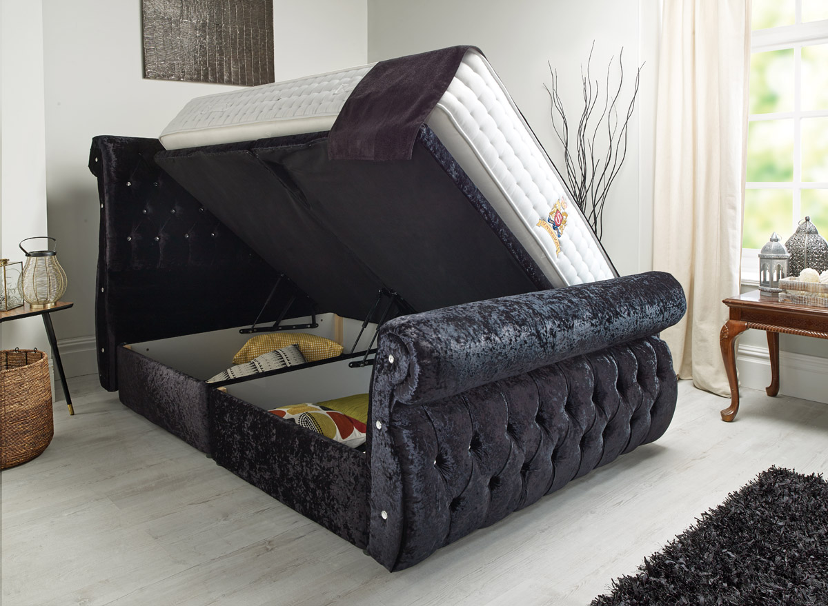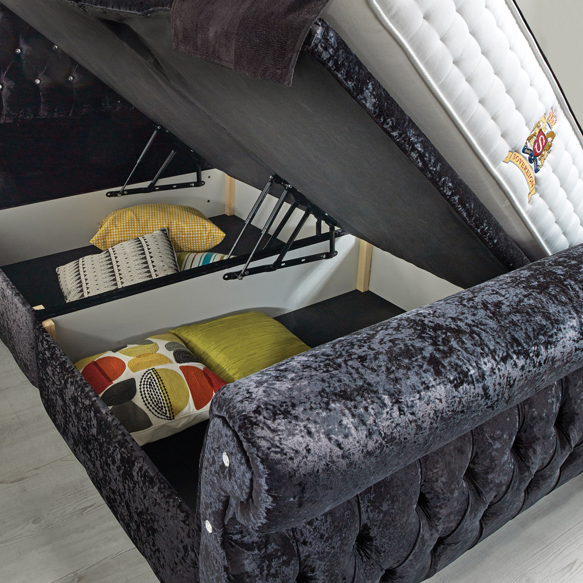 =The Oxford Ottoman Bed is a bold and luxurious choice for those who want traditional elegance with modern functionality. Its floor standing headboard is crafted as a single full piece for strength and durability, featuring deep button tufting and a sleigh-style silhouette with pronounced scrolls. The matching footboard mirrors the scroll detail, creating a balanced and regal presence in any bedroom.
