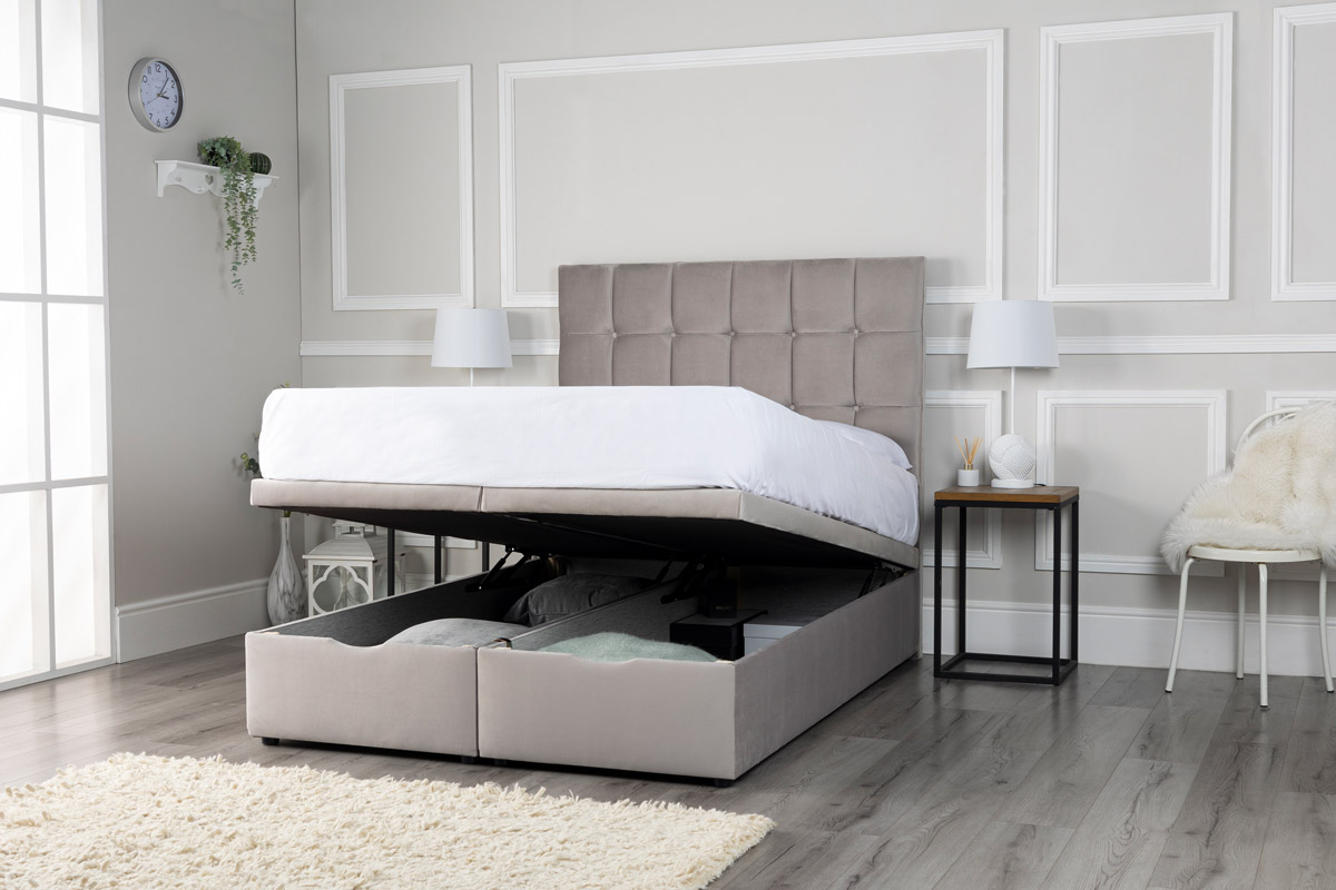 The Cube Ottoman Bed is designed for those who appreciate structure and simplicity. Its floor standing headboard stands at 54 inches (50 inches for the 3ft size) and showcases a striking grid tufted pattern that adds depth and modern character to any bedroom.