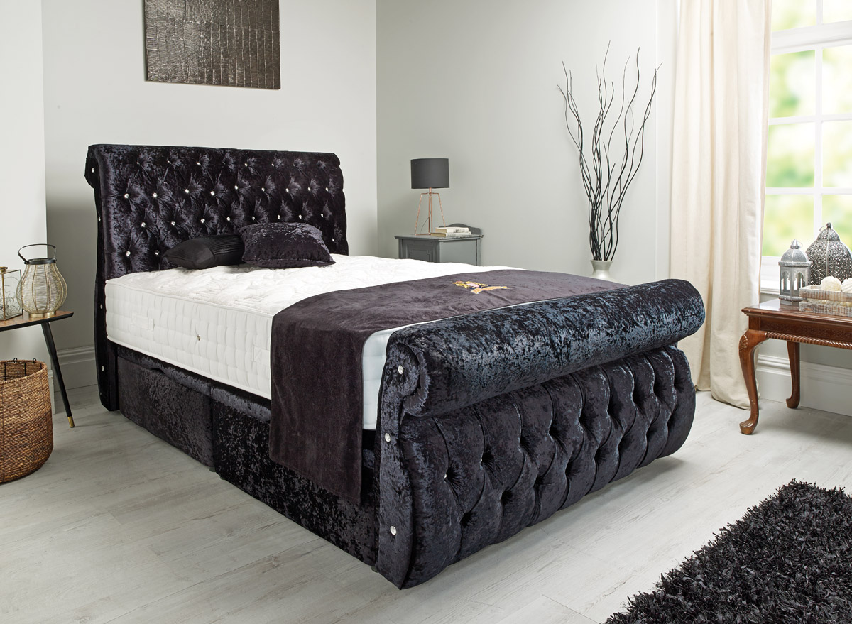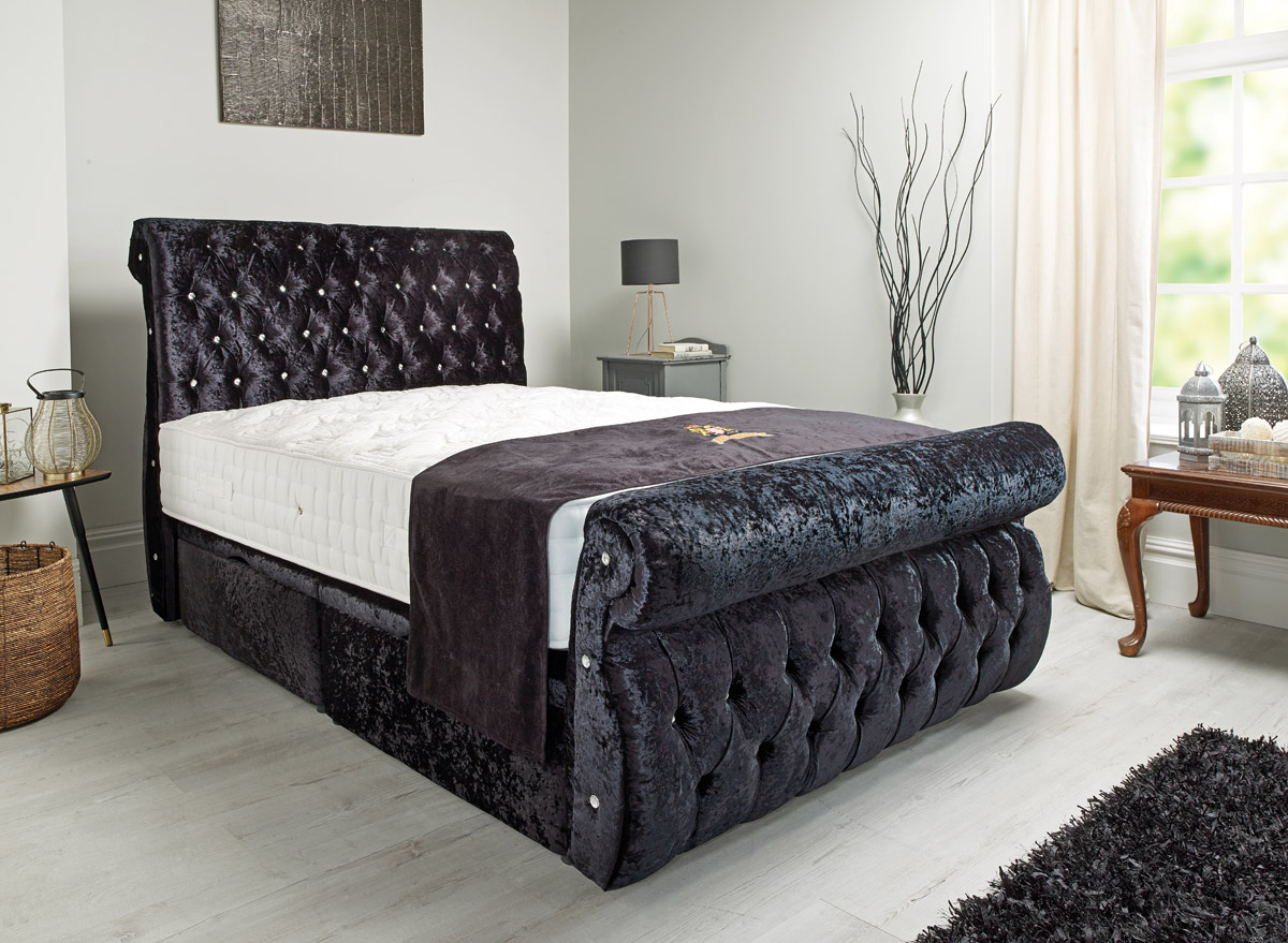=The Oxford Ottoman Bed is a bold and luxurious choice for those who want traditional elegance with modern functionality. Its floor standing headboard is crafted as a single full piece for strength and durability, featuring deep button tufting and a sleigh-style silhouette with pronounced scrolls. The matching footboard mirrors the scroll detail, creating a balanced and regal presence in any bedroom.